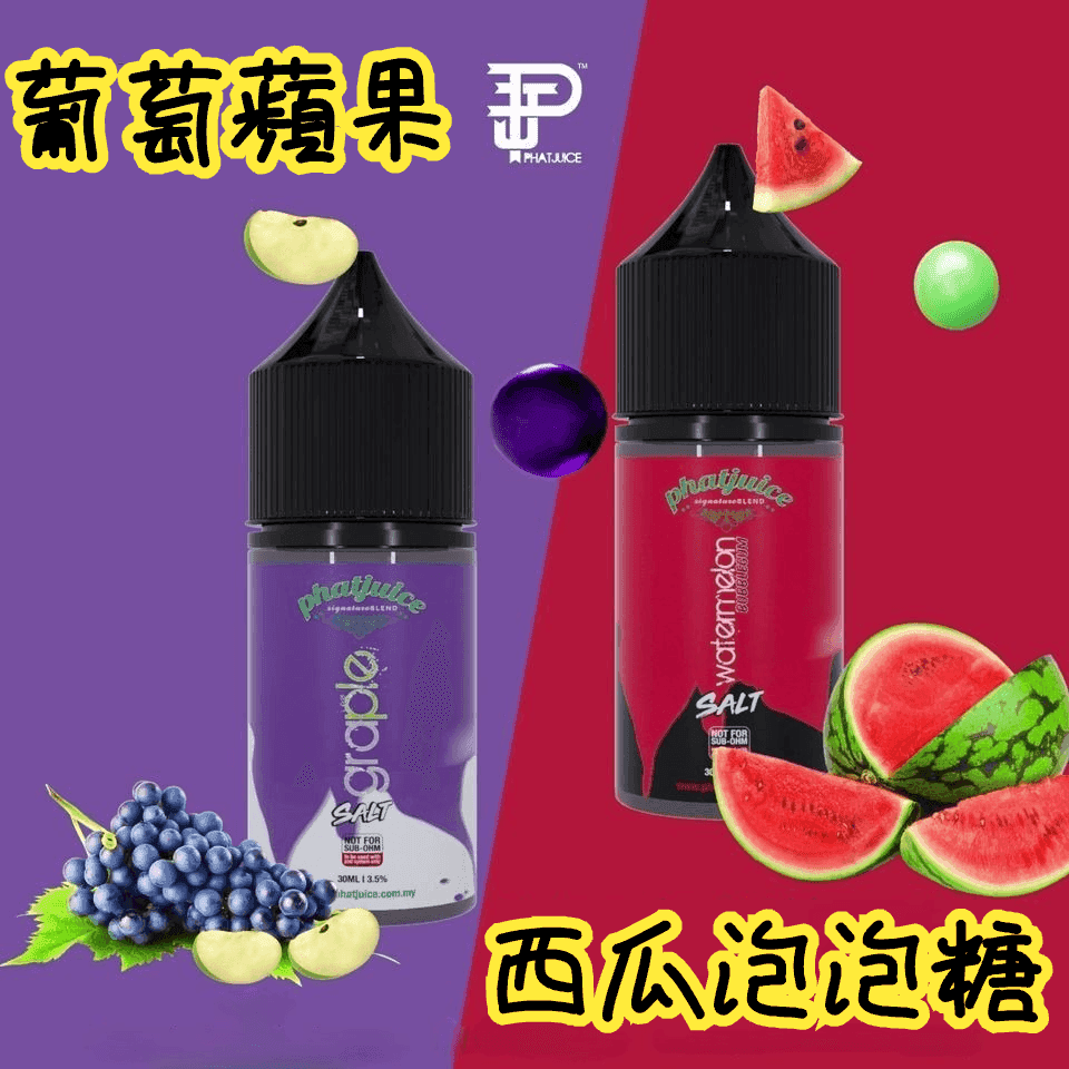 令人垂涎的葡萄味,與帶有薄荷味的脆蘋果混合在一起。冰冷清新全天電子煙的絕佳選擇。酷斃葡萄電子煙小煙油phatjuice 30ml西瓜泡泡糖馬來西亞進口